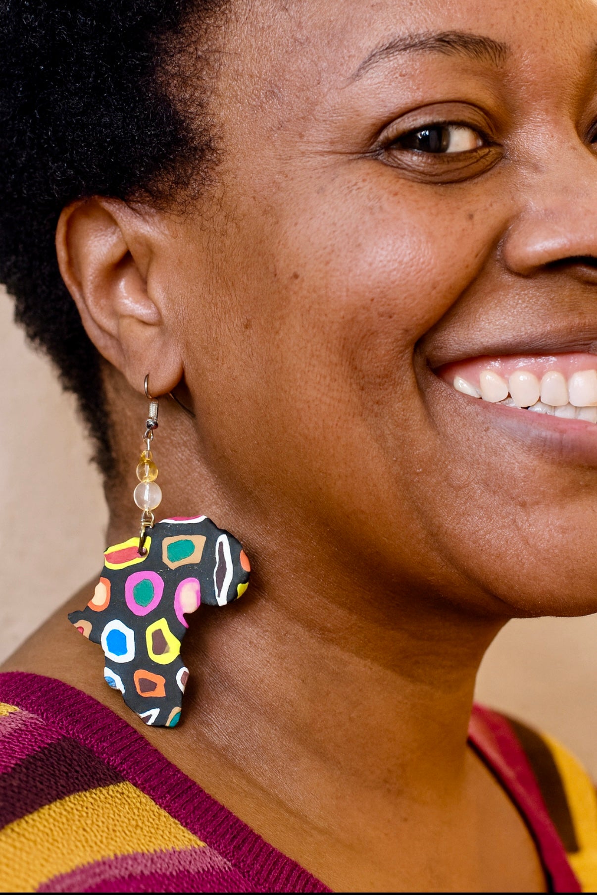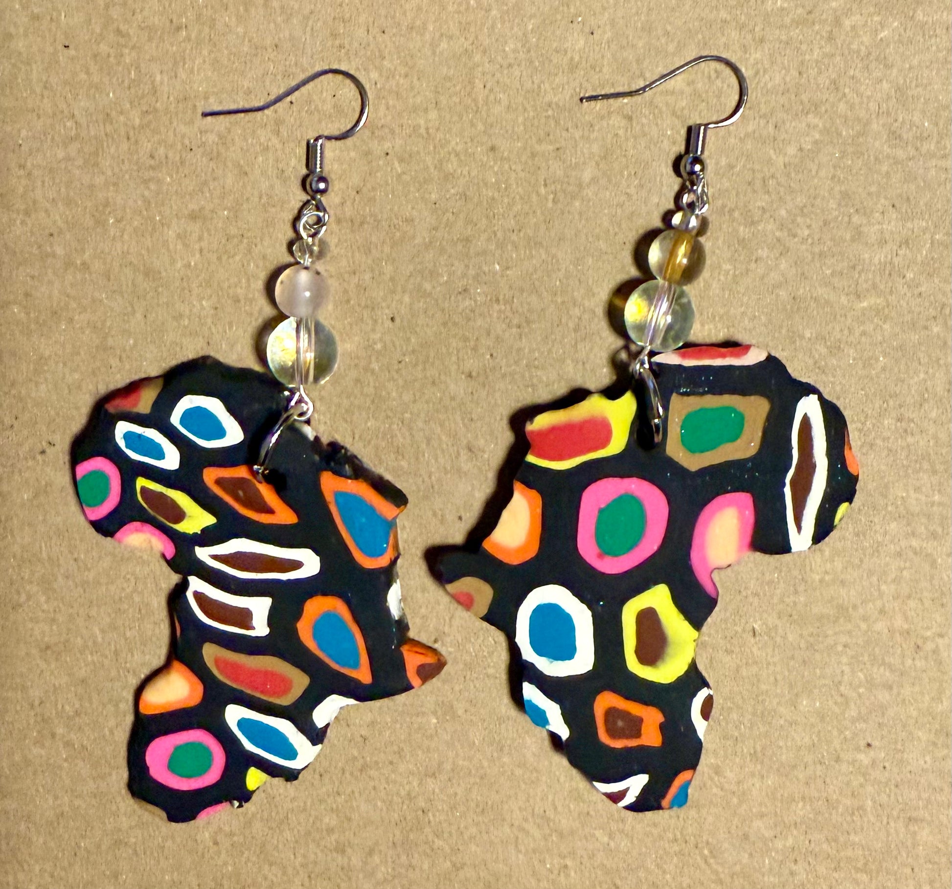 Celebrate culture and color with these bold, handcrafted earrings. Shaped like the African continent, each piece is made from durable polymer clay and hand-decorated with vibrant, multicolored patterns that pop against a sleek black background. Accented with translucent beads and finished with silver-tone hooks, these earrings are lightweight yet eye-catching—perfect for making a statement wherever you go.