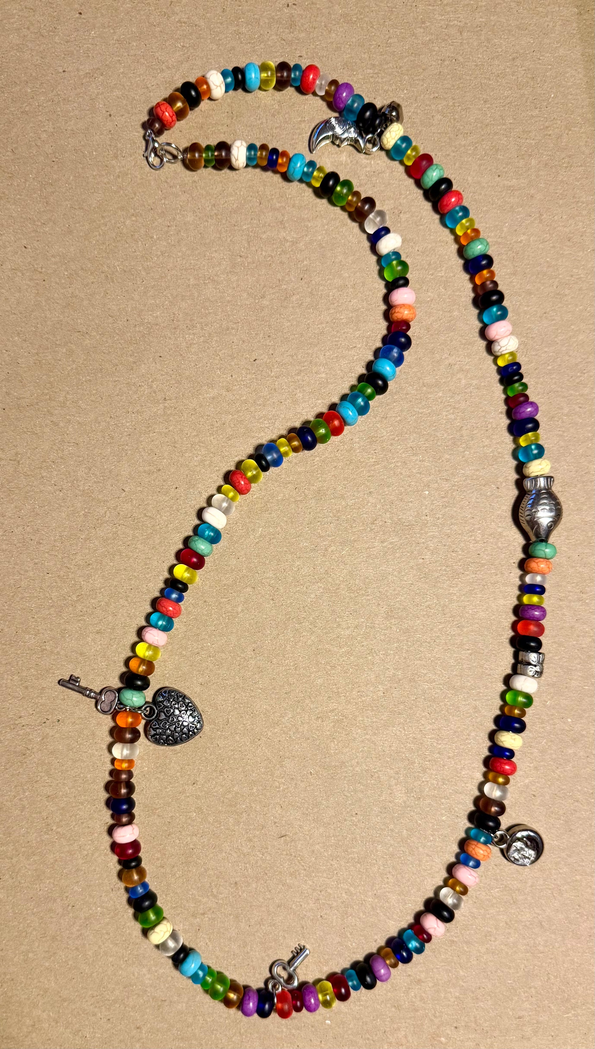 Brighten up your style with this playful, one-of-a-kind necklace featuring a vibrant mix of colorful glass beads. The design is accented with silver-tone charms, including a heart lock and matching keys, symbolizing love and protection. Lightweight and fun, this piece is perfect for layering or wearing solo to add a joyful pop of color to any outfit.