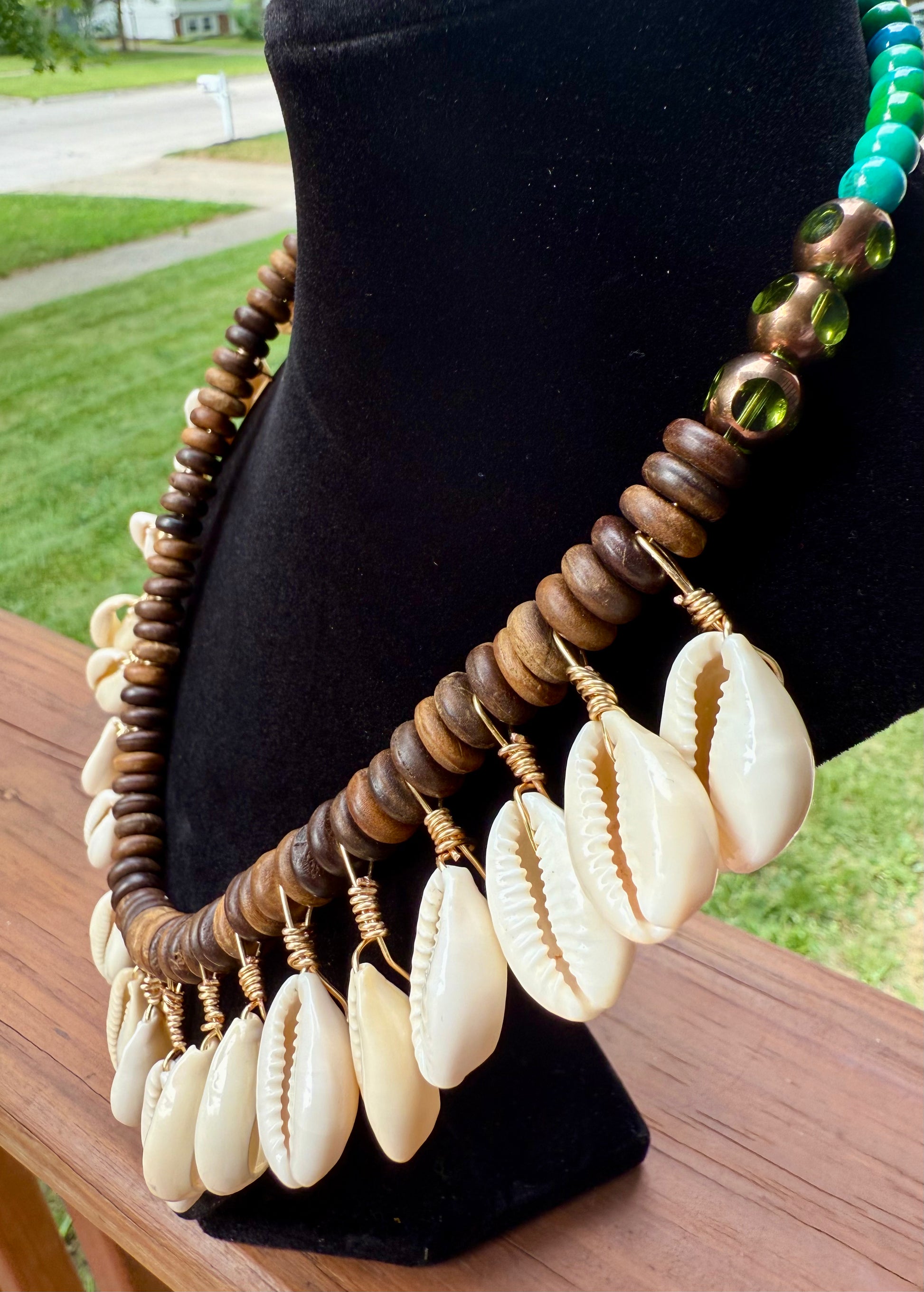 Celebrate natural beauty and cultural heritage with this handcrafted cowrie shell necklace. Designed with a striking combination of earthy wooden beads, bold green accents, and dangling natural cowrie shells, this piece radiates rustic elegance and spiritual symbolism.