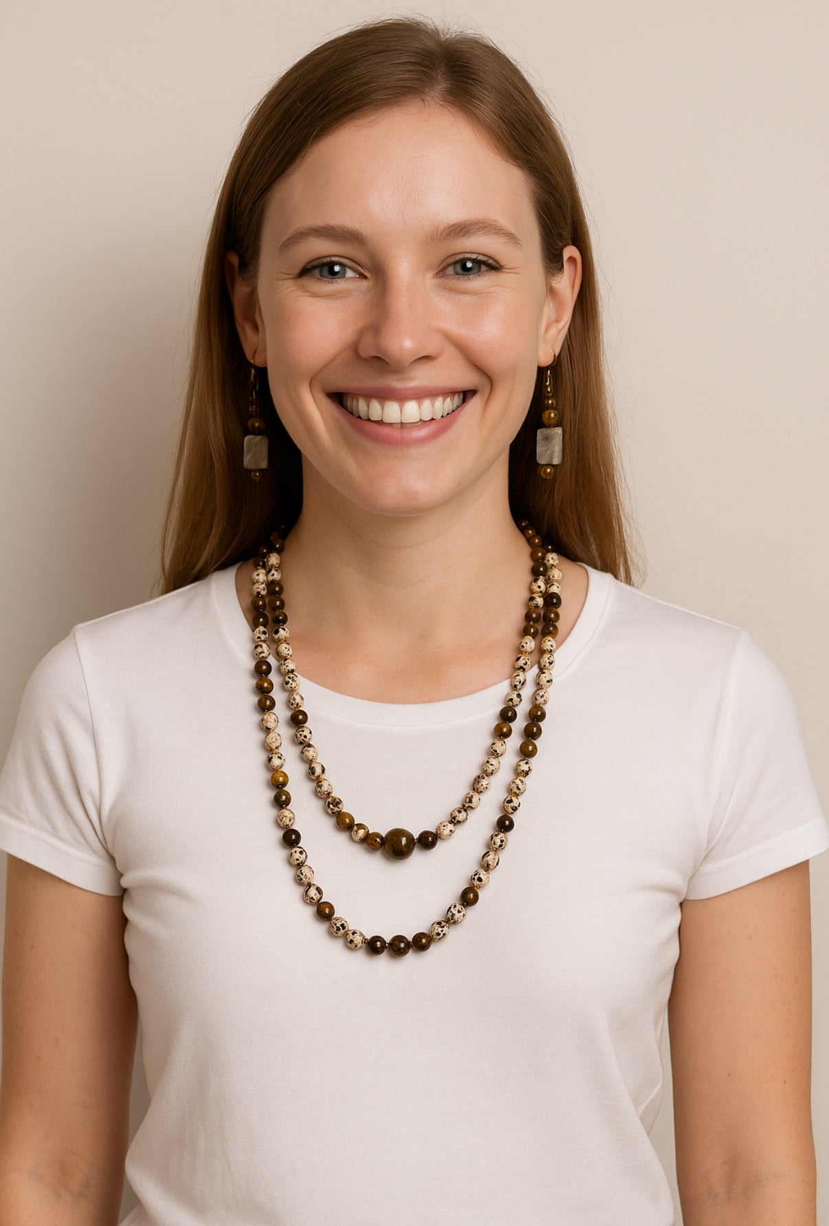 This handcrafted jewelry set features a stunning combination of Dalmatian Jasper and Tiger’s Eye beads. The double-layered necklace showcases earthy tones of cream, brown, and black, accented with the golden shimmer of Tiger’s Eye at the center for a grounding yet elegant touch. Matching dangle earrings complete the set, designed with rectangular stone accents that add a unique, natural flair. Perfect for both casual and dressy occasions, this set radiates balance, strength, and timeless beauty.