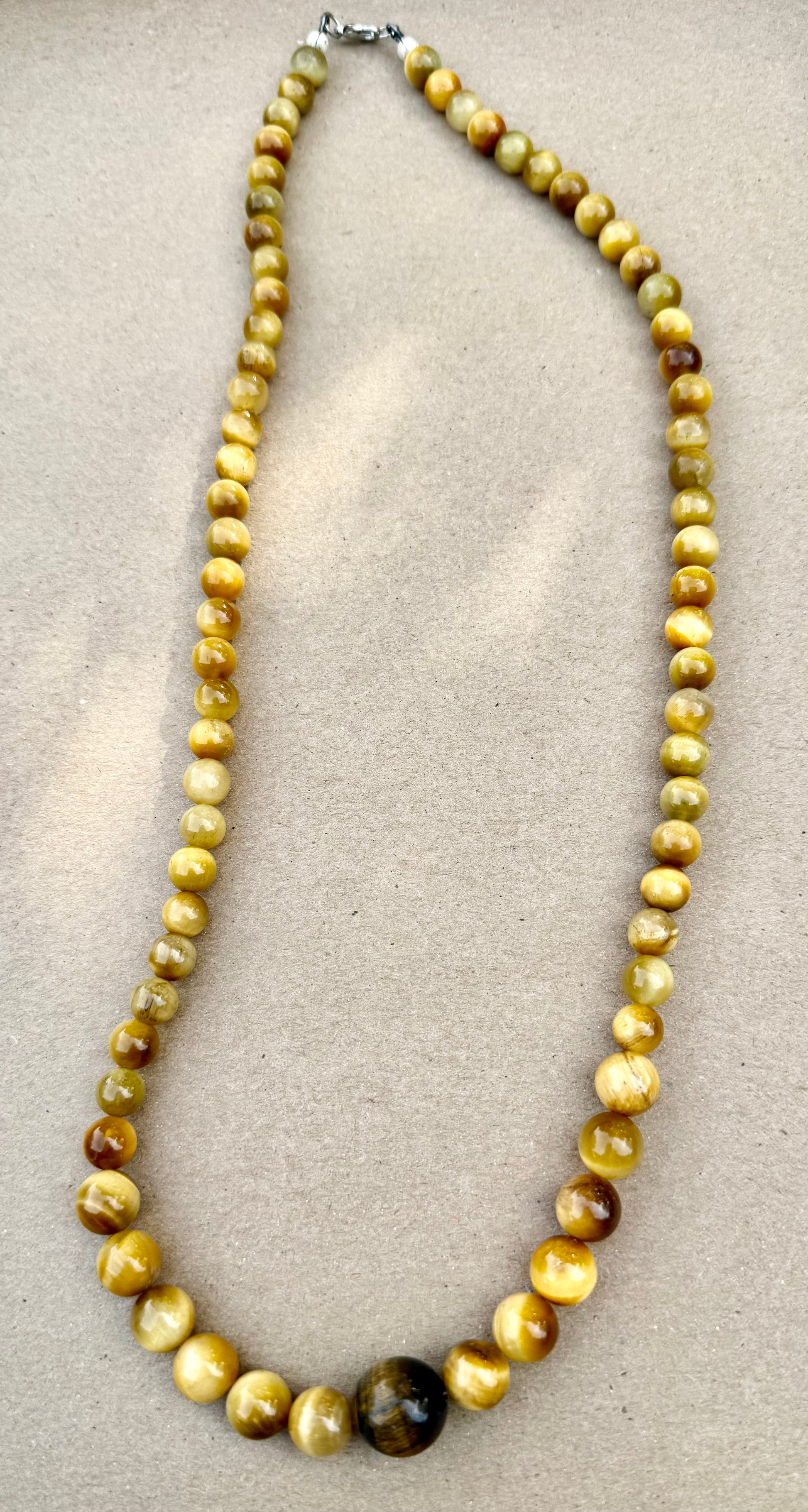 This radiant handmade necklace features polished golden Tiger’s Eye beads, known for their mesmerizing shimmer and protective energy. Each bead glows with natural variations of honey, amber, and deep brown tones, creating a warm and earthy elegance. The piece is designed to reflect light beautifully, making it a versatile accessory for both casual and sophisticated looks. A timeless expression of strength and confidence, perfect for anyone drawn to natural gemstones and classic craftsmanship.