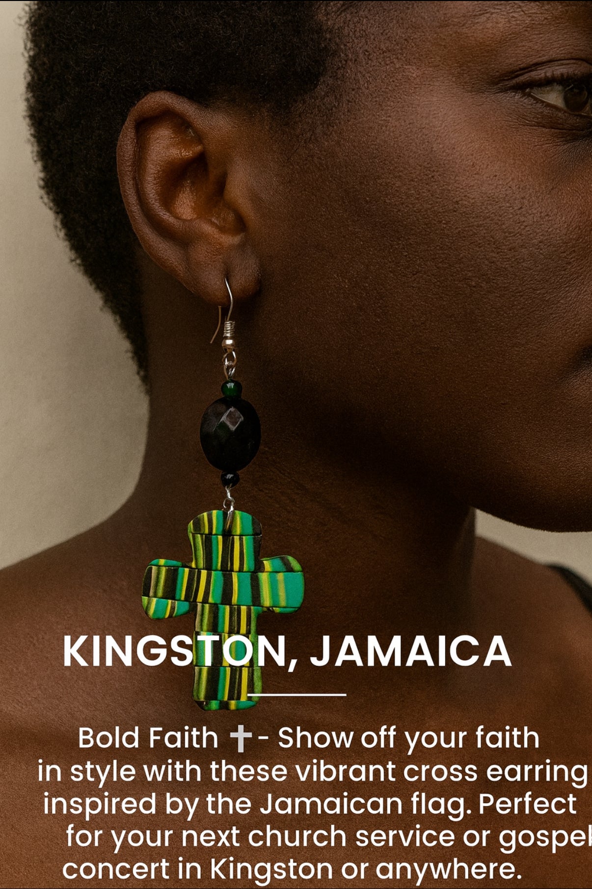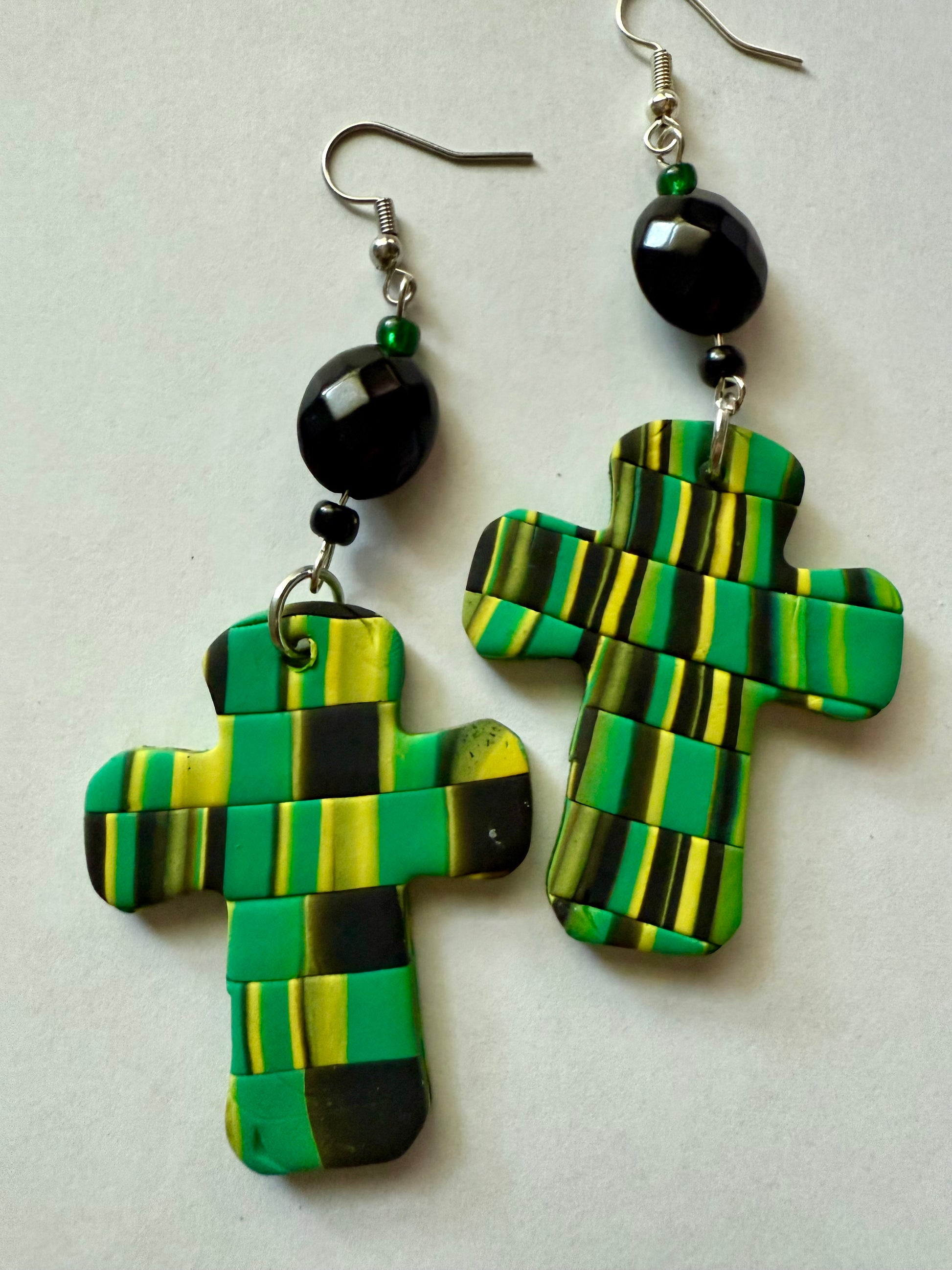 Handmade with love, these bold polymer clay cross earrings showcase vibrant green, yellow, and black stripes—perfect for expressing faith with a stylish Jamaican flair.”
