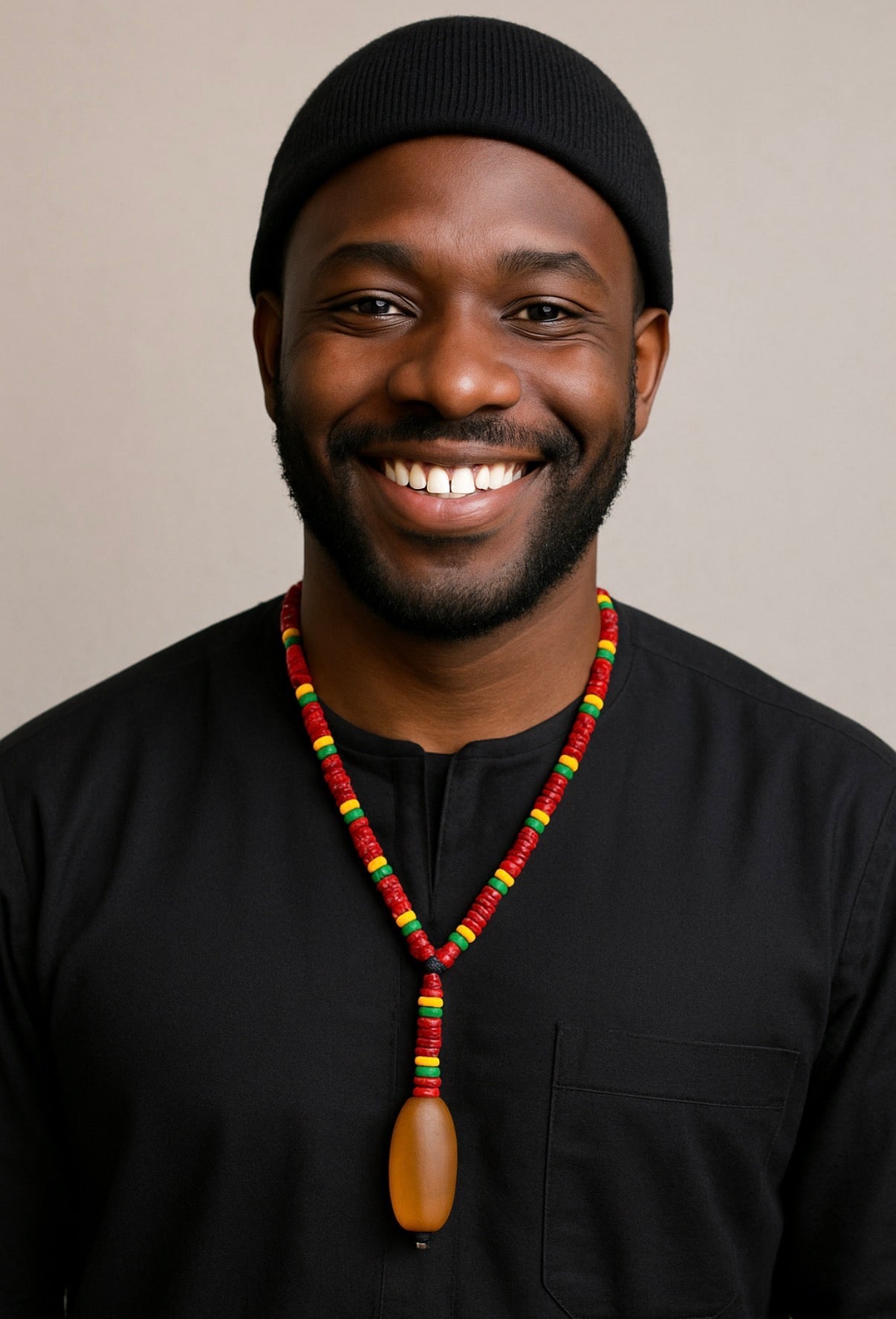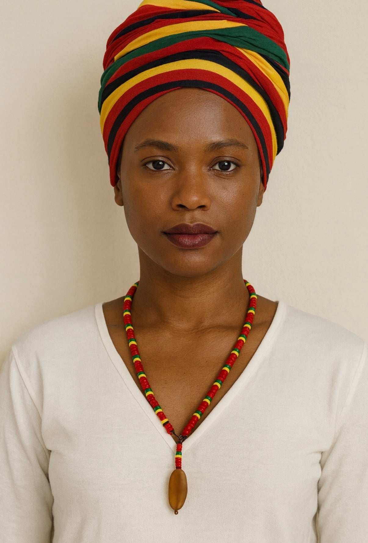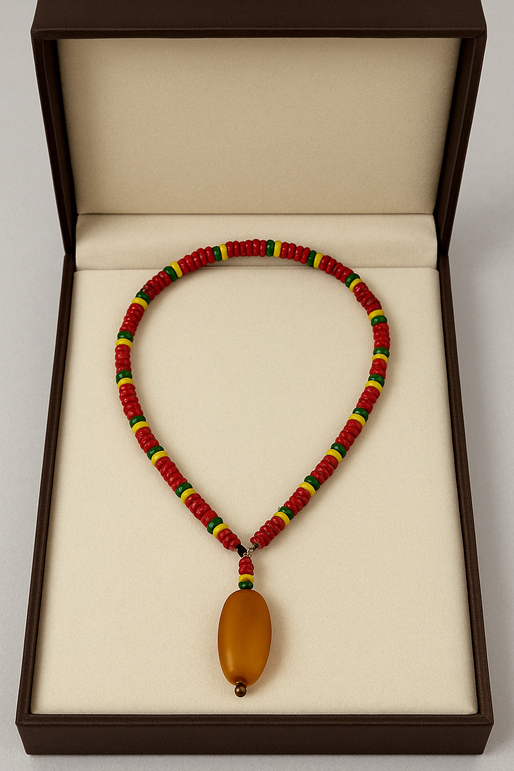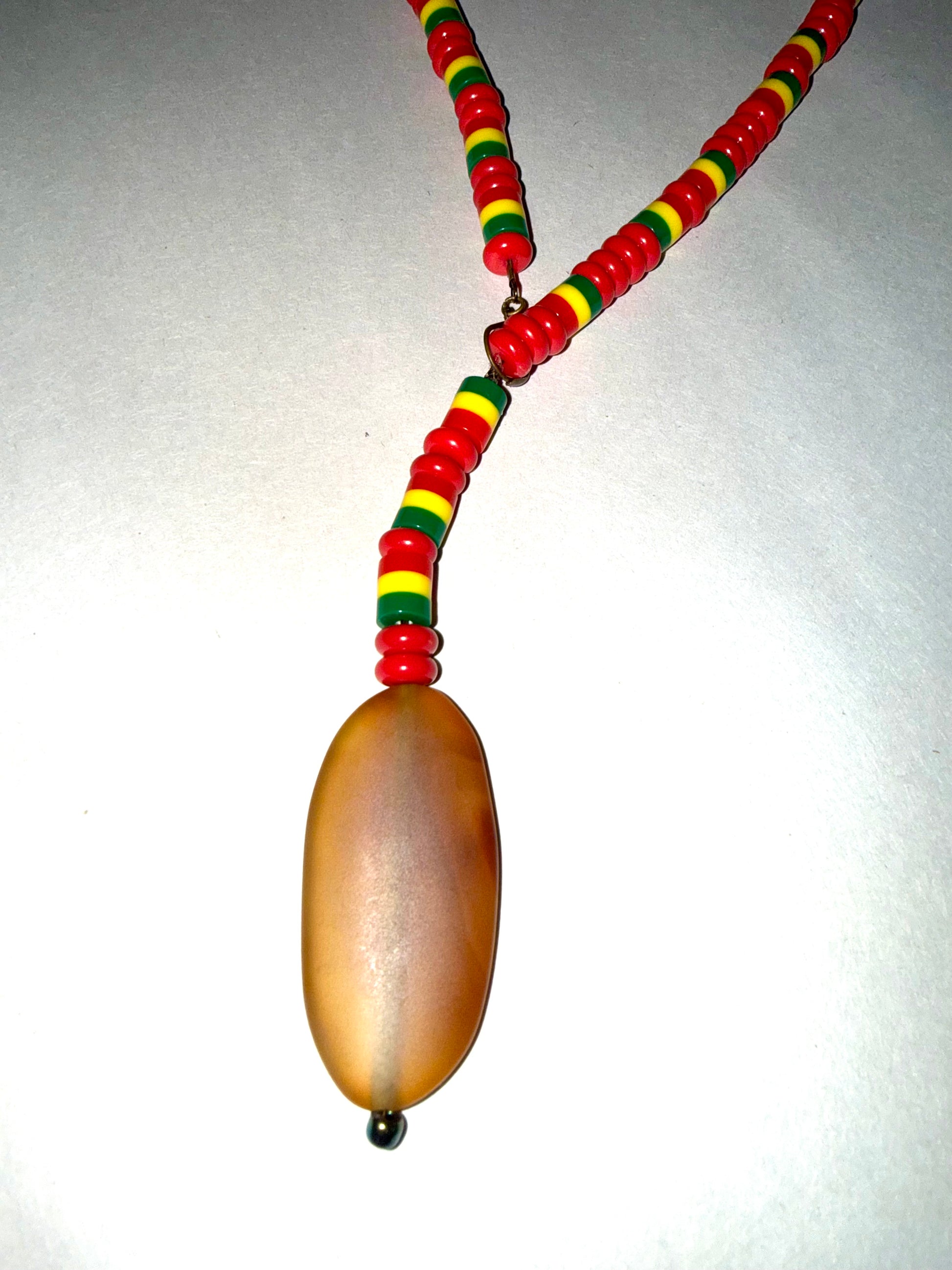 This vibrant handmade necklace celebrates African and Rasta-inspired color and spirit. The piece features a bold mix of red, yellow, green, and black glass beads, symbolizing strength, unity, and heritage. At its center hangs a stunning frosted agate stone, smooth to the touch and softly matte, radiating an earthy, natural warmth.