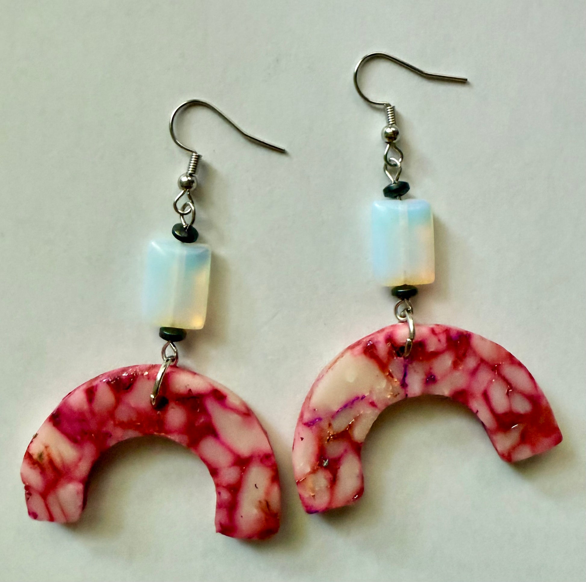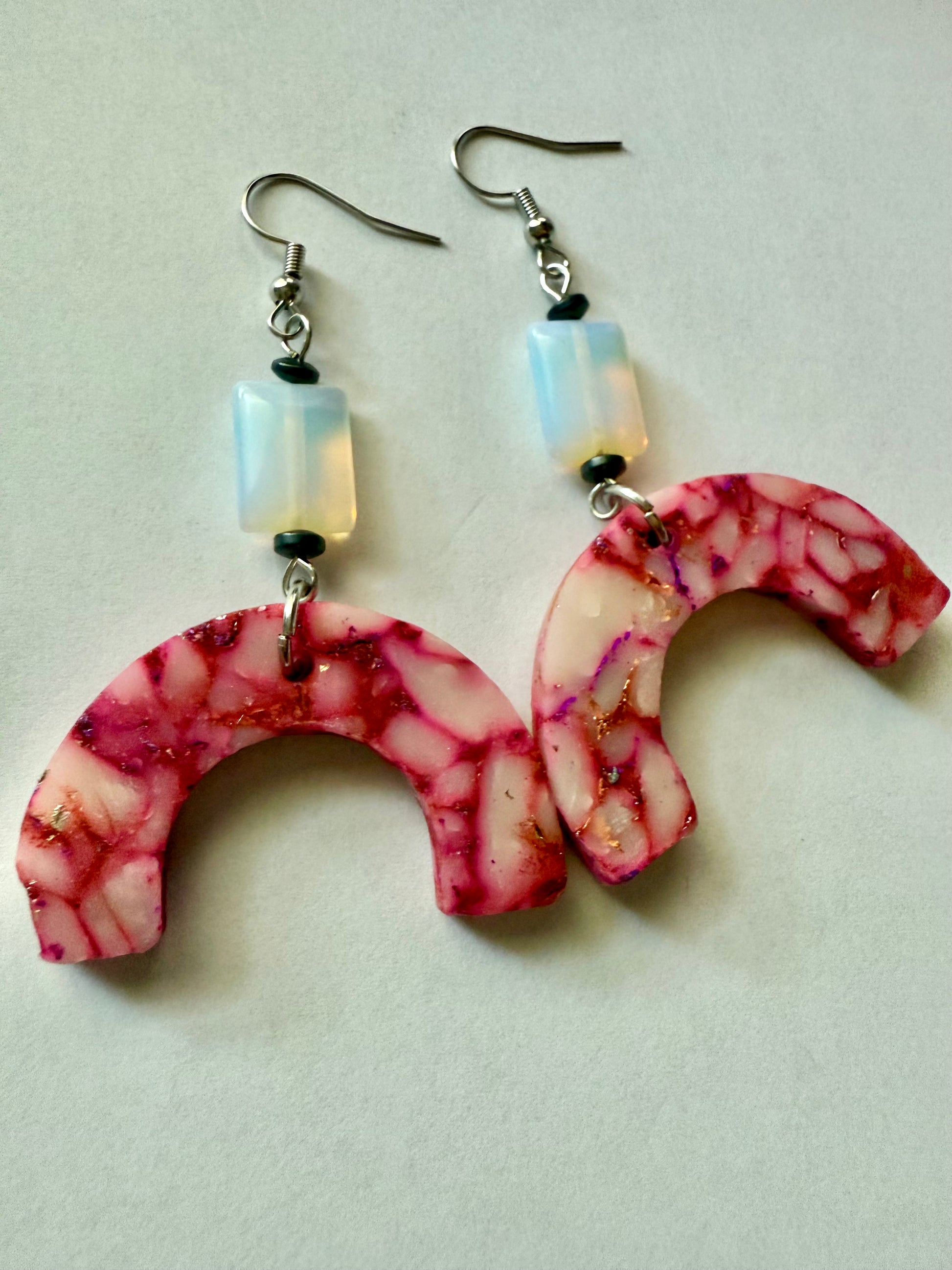 “Bold and artsy, these handcrafted polymer clay earrings feature a vibrant marbled pink design paired with luminous beads—perfect for making a playful yet chic statement.”