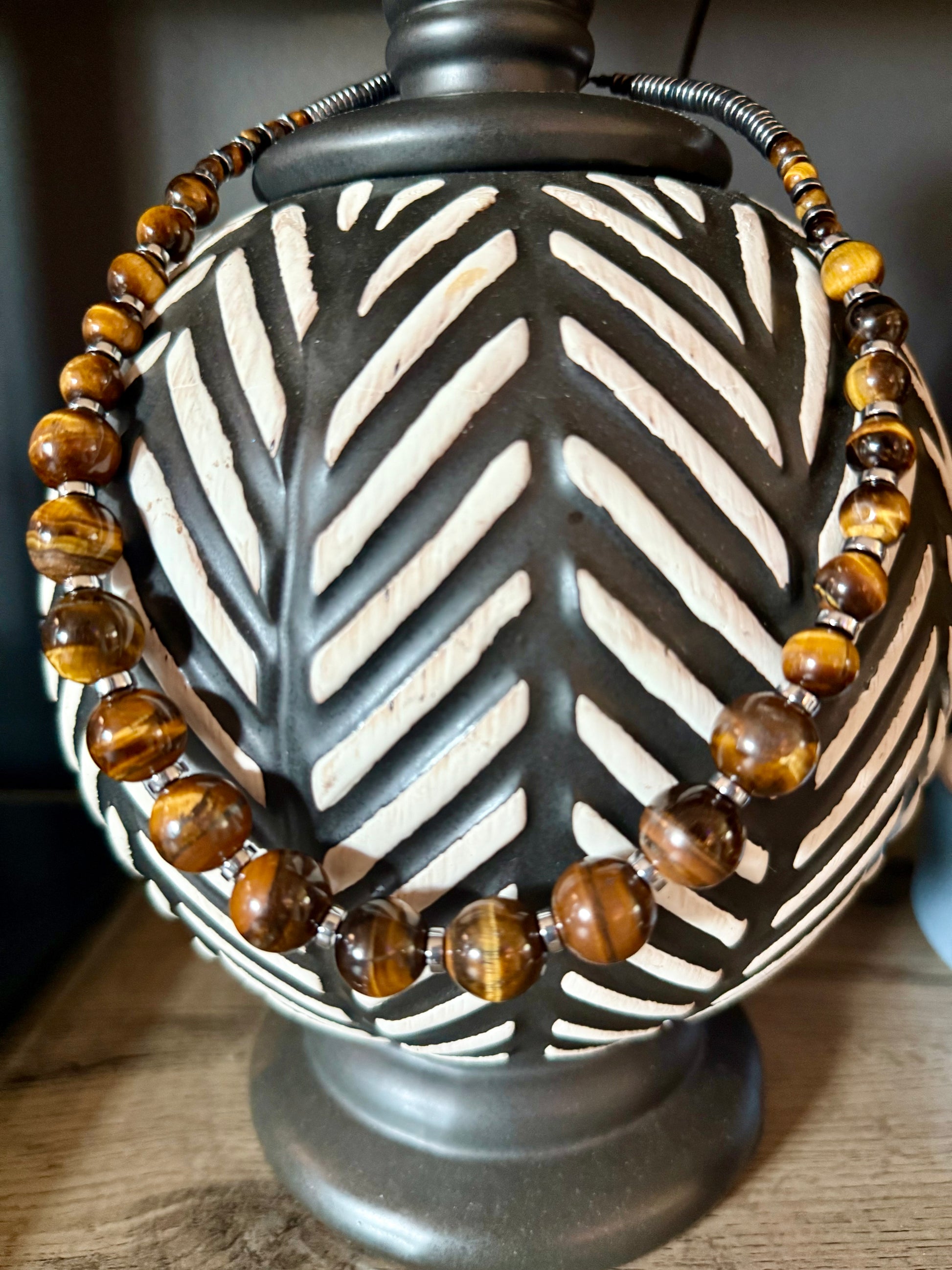 This striking necklace features an arrangement of polished tiger's eye beads, known for their mesmerizing golden-brown hues and chatoyant (cat's-eye) effect. The beads vary in size, with the larger, round beads prominently displayed at the center, gradually transitioning to smaller beads towards the clasp. Accentuating the tiger's eye are metallic spacer beads that add a touch of contrast and elegance. The necklace is finished with a secure hook clasp, ensuring both style and functionality. Perfect for adding a natural, earthy charm to any outfit. 22 inch’s
